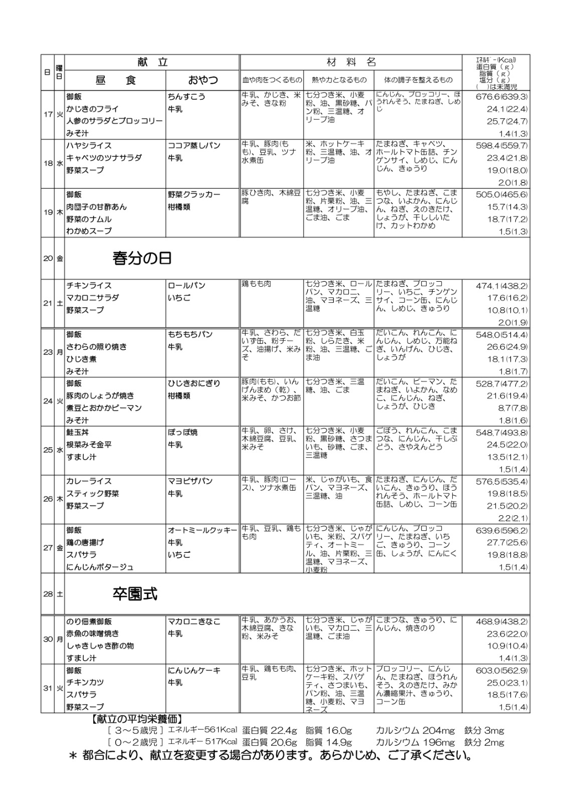 3月の給食献立
