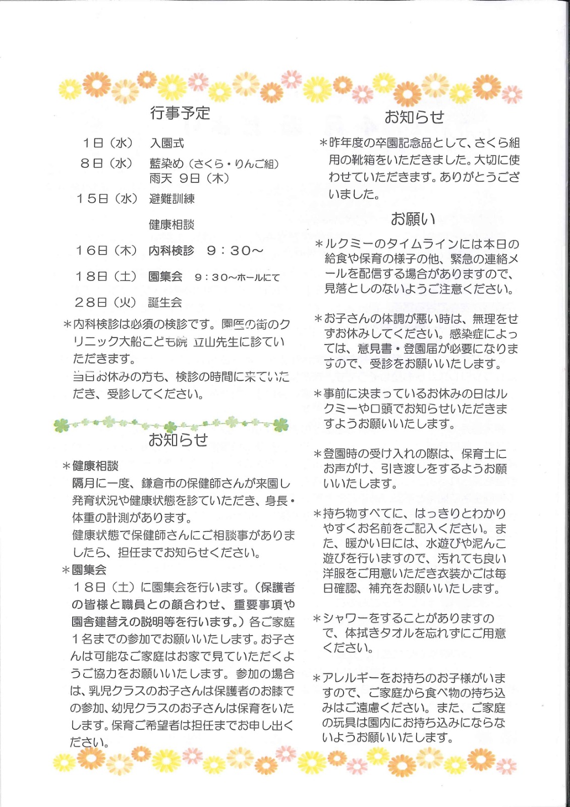 園からのお知らせ・おたより|梶原の森たんぽぽ保育園