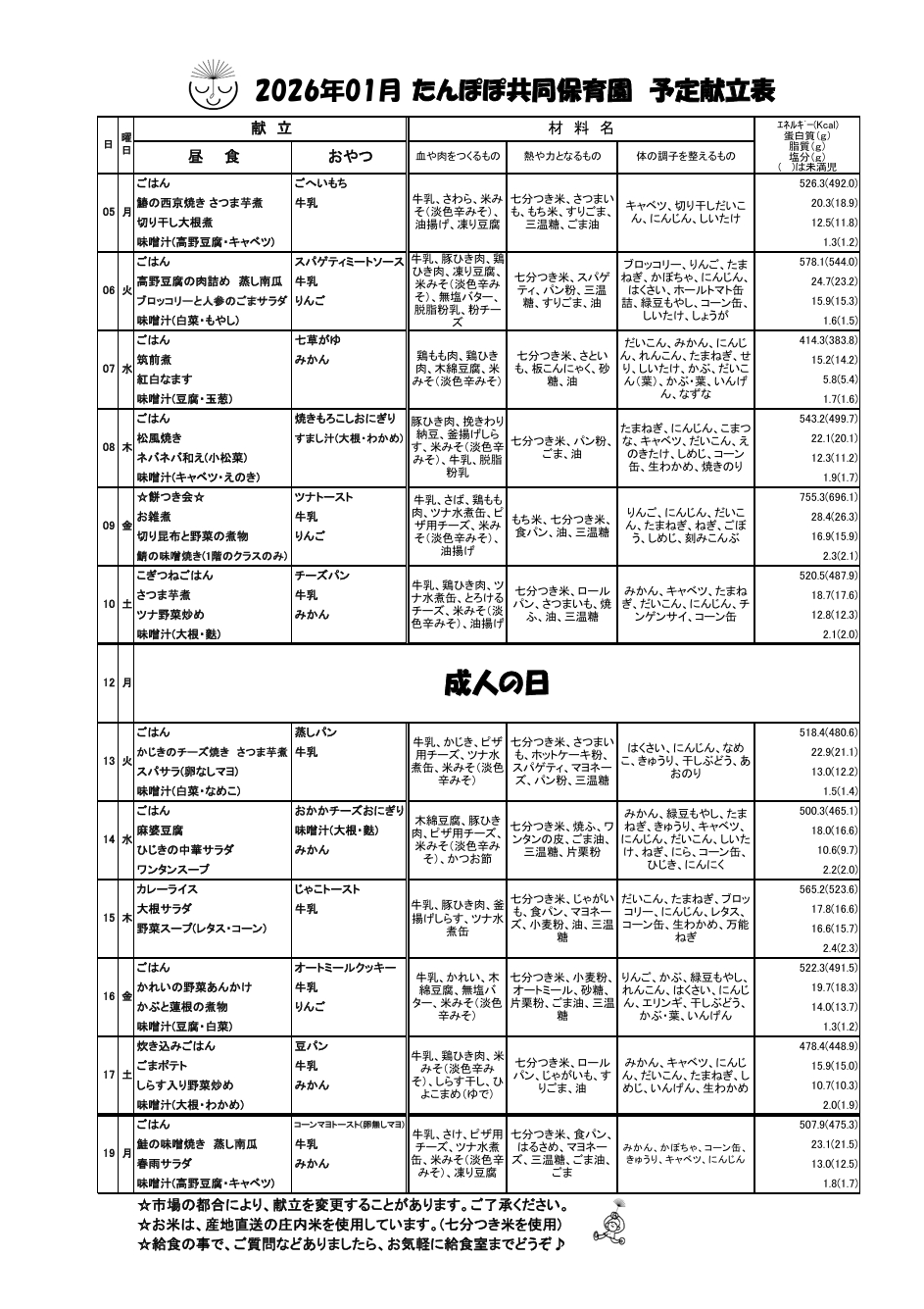 給食だより1月号・献立表